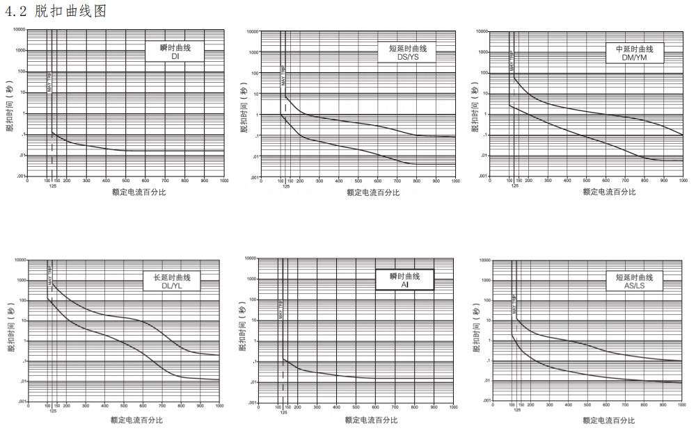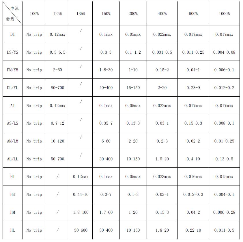 4.1 脱扣时间表(时间单位:s)